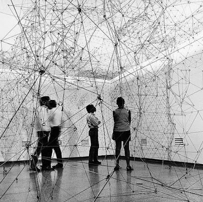 Above: Gego (Gertrud Goldschmidt), "Reticularea", 1972. Exhibition view from Museo de Bellas Artes, Caracas. You can see the influence of Gego's ideas on Sarceno's installations 40 years later.